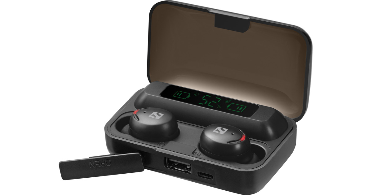 True wireless sound directly to your ears, entirely without cables, not even between the two ear plugs. You get an attractive earphone for each ear, which sits comfortably and discretely in the ear providing a sublime sound quality. They connect wirelessly to a Bluetooth device, such as a smartphone or tablet computer. They are charged in the included case, doubling as a powerbank, which can charge your smartphone while you are on the go. In this way you always have backup power and wireless sound with you!