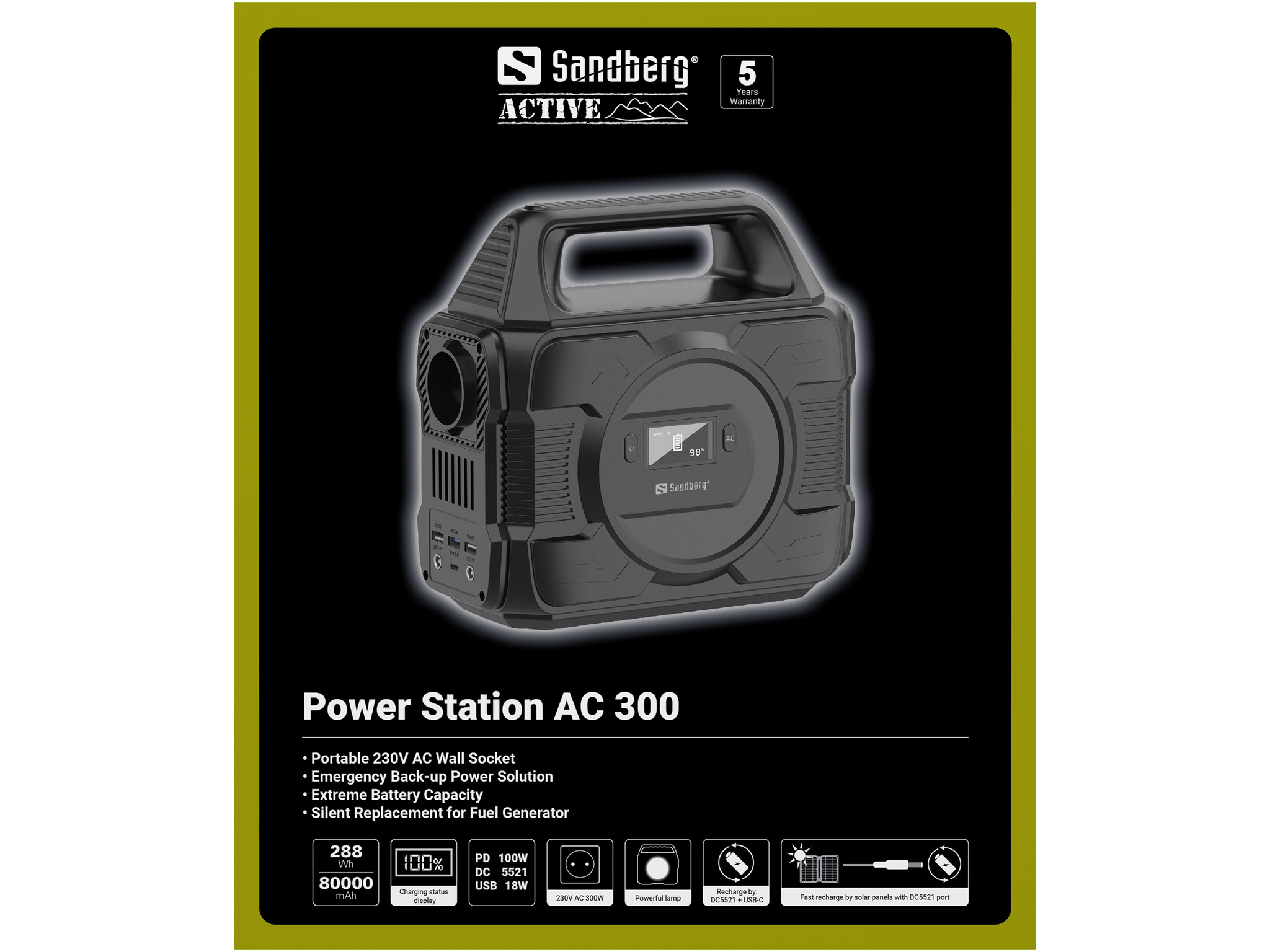 Sandberg Power Station 300 AC je vaš mobilni snabdevač energije. Imaćete dovoljno energije za svoju mobilnu opremu, na primer, mobilne telefone, tablete, laptopove, i ne manje važno, konvencionalnu strujnu utičnicu od 230 V AC, koja obezbeđuje do 300 W energije. Savršeno za kampovanje, na brodu, kada radite u bašti, na muzičkom festivalu, za svu vašu video opremu ili kao sigurno rešenje, spremno da vam obezbedi rezervno napajanje kod kuće ili na poslu u slučaju nestanka struje.