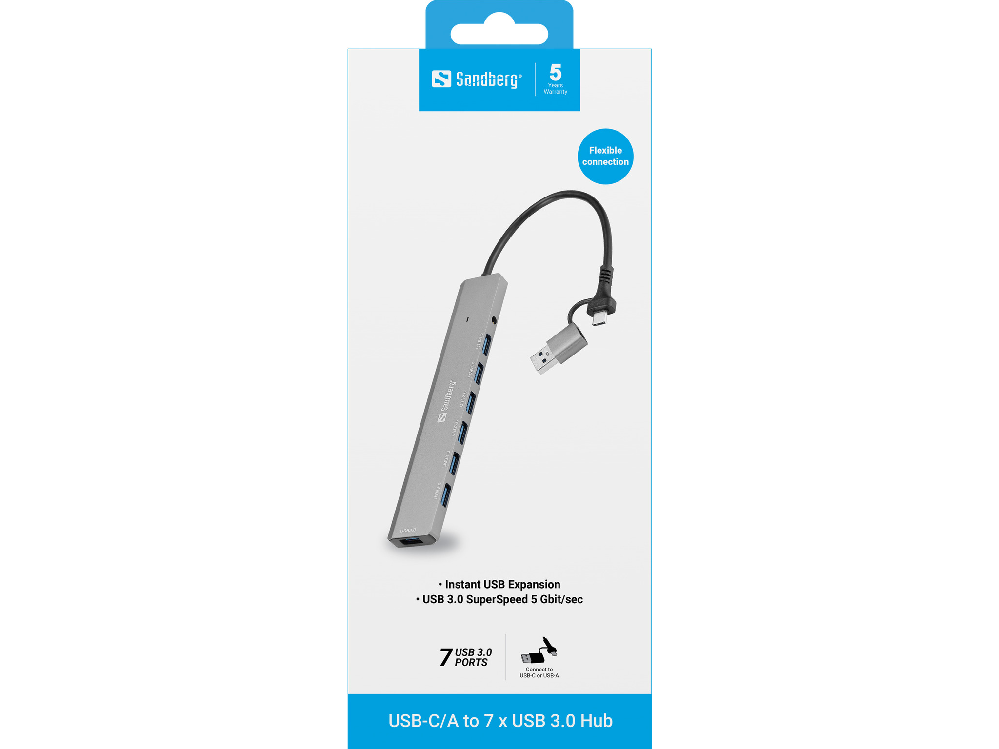 Sandberg USB-C/A to 7 x USB 3.0 Hub pruža maksimalnu slobodu povezivanja. Povežite do 7 USB-A uređaja kao što su eksterni hard diskovi, štampači, miševi i drugi periferni uređaji. Hub je kompatibilan sa modernim laptopovima sa USB-C, kao i sa starijim računarima sa USB-A.